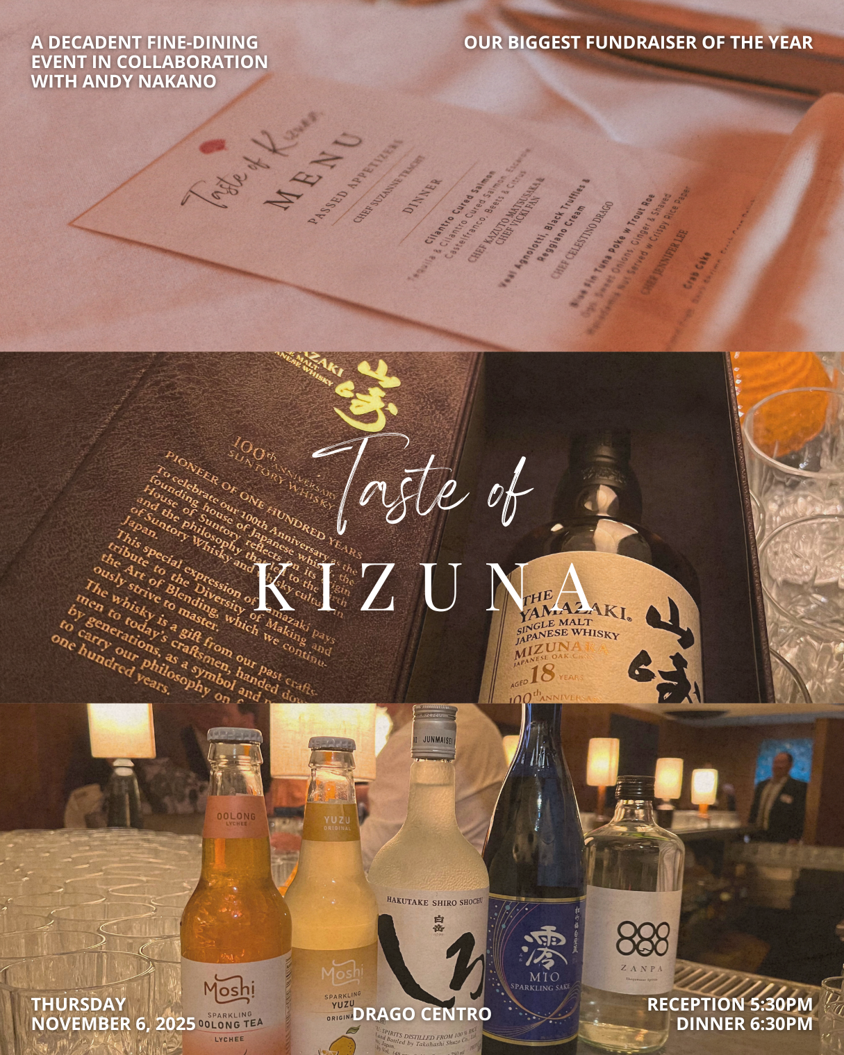 Taste of Kizuna, happening on Thursday, November 6, 2025, at Drago Centro. This unforgettable evening combines gourmet dining with community growth as we work together to raise $75,000 to sustain Kizuna’s cultural programming all year long. Due to high demand, we opened up 25 more seats this year