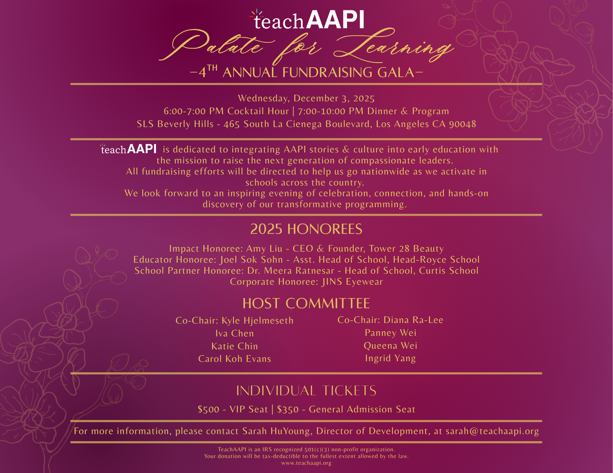 TeachAAPI will be hosting our 4th Annual Palate for Learning Gala on Wednesday, December 3rd at the SLS Hotel in Beverly Hills. Join us from 6:00-10:00 PM to enjoy an evening of celebration and hands-on experiences with the innovative programming that we are bringing to students nationwide. We are honored to be joined by 4 honorees who have demonstrated their extraordinary commitment to sharing TeachAAPI’s mission to redefine American education and broaden the scope of understanding and compassion of our next generation.