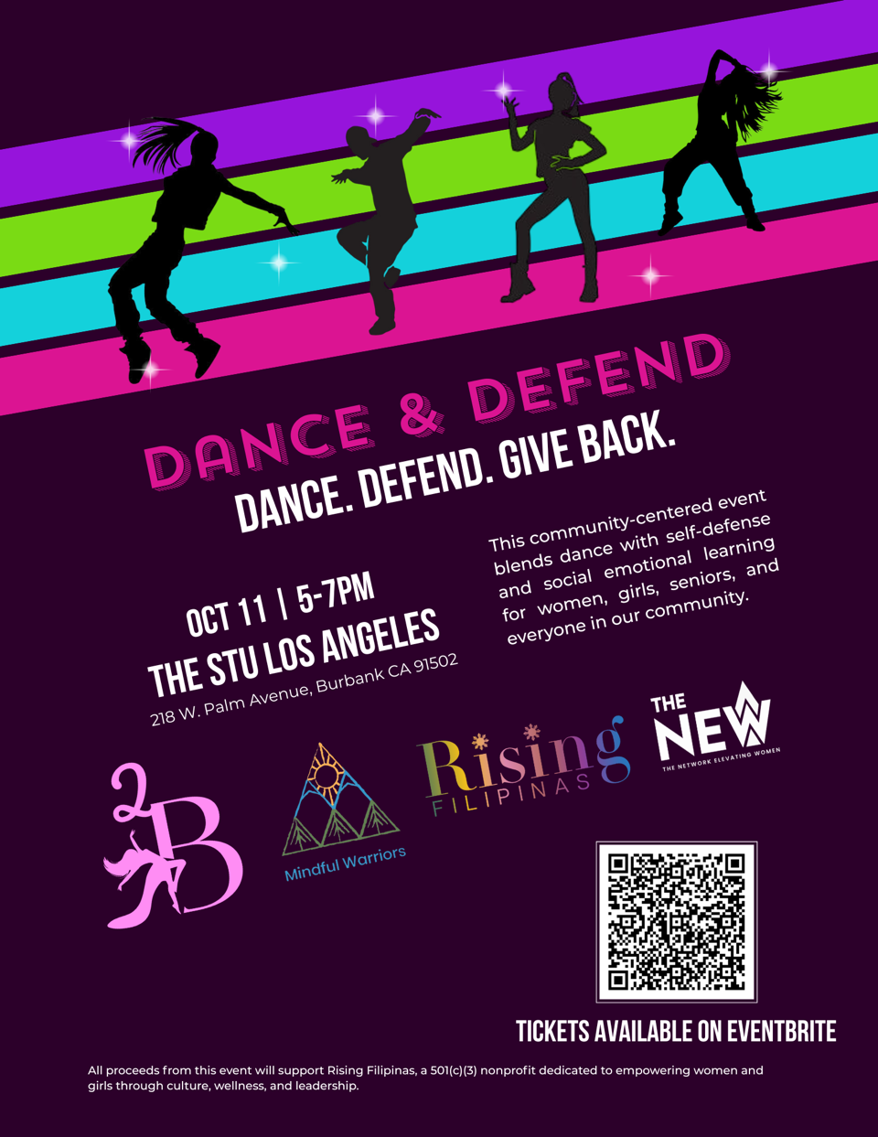 Early Bird BOGO $25: Buy 1 ticket 🎟️ and bring a family/family member for free available only until Sept 20 ONLY Get ready for a fun and family-friendly community event in Burbank! Dance & Defend brings everyone together for beginner-friendly dance sessions, practical self defense training, a local vendor marketplace, and an online auction + raffle through Event.Gives. What’s Happening Beginner-friendly dance session with Brooke Coutinho (2B Studios) Self defense training with Coach Jeff (Mindful Warriors) Local vendor marketplace + online auction and raffle through Event.Gives Community connection, cultural pride, and family fun Why it Matters All proceeds benefit Rising Filipinas, a 501(c)(3) nonprofit in Greater Los Angeles. Donations are tax deductible and directly support our community programs in wellness, cultural pride, financial literacy, youth empowerment, and social emotional learning. These programs help women, girls, and families build resilience, confidence, and leadership skills that create lasting impact. Bring your friends, family, or little ones! This is a safe, inclusive, and joyful event for all ages.