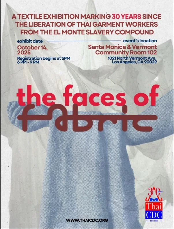 The Faces of Fabric: A Textile Exhibition to honor the survivors from the El Monte Thai Garment Slavery Case is an immersive exhibition marking the 30th anniversary of a landmark human rights case. This exhibit utilizes fabric and multidisciplinary works, featuring photos provided by Judy Branfman, to highlight labor, showcasing textile art and storytelling that confronts exploitation in the garment industry and beyond.