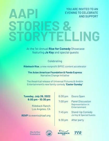 Please join The Asian American Foundation, The MacArthur Foundation, and Panda Express for an evening to celebrate and support AAPI Stories & Storytelling on Tuesday, July 26, 2022, 6:00 pm at Rideback Ranch in Los Angeles.