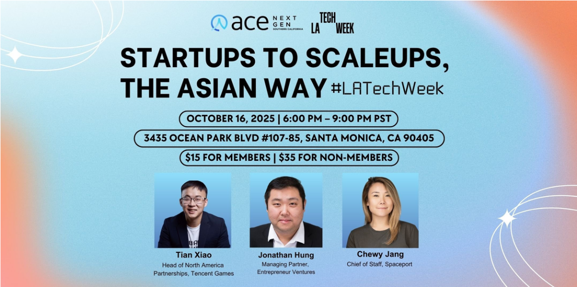 "Asian entrepreneurs and investors are shaping the future of innovation, not just in Silicon Valley, but across the globe. At ACE NextGen, we believe our cultural edge—resilience, adaptability, community—fuels founders to go beyond launching startups and scale into enduring companies. ACE NextGen is a nonprofit dedicated to uplifting Asian American entrepreneurs and investors through community, mentorship, and opportunity. Our mission is to build lifelong relationships and empower the next generation of leaders to thrive in business and beyond. Join us during LA Tech Week for a night of connection, food, and stories. Hear from Asian founders who've scaled their companies, meet investors who champion cross-border opportunities, and connect with a community that celebrates the cultural edge as a force for growth. This isn't just another networking event—it's a celebration of the unique role Asian entrepreneurs play in the startup ecosystem, and how together we can scale legacies.