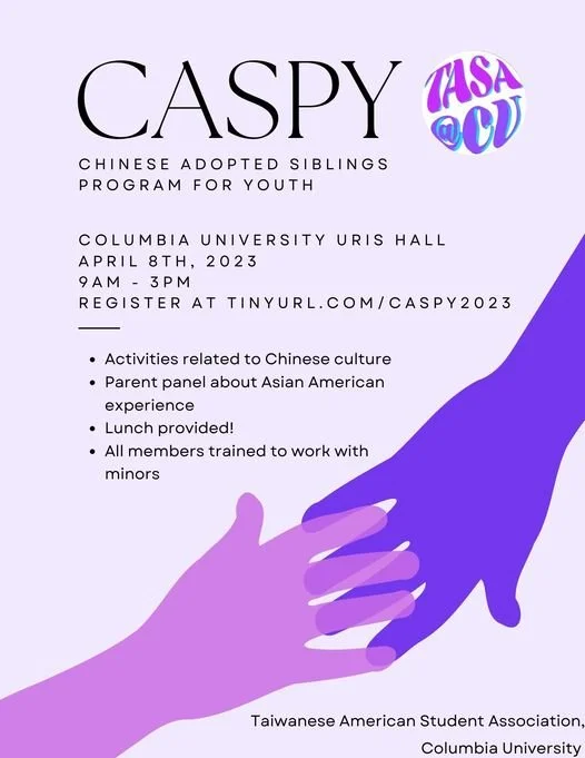 Columbia University Taiwanese American Student Association would love to invite all NYC-residing Asian Adoptees to our 2023 CASPY (Chinese Adopted Students Program for Youth) Day. CASPY is a program designed to engage adopted Asian children from the ages 6 - 16 in activities focused on Asian culture and identity (ex. calligraphy, 123 mu ruo ren, etc). We pair college aged "big siblings" with attendees to foster a one-on-one learning environment that uses performance, discussions and a whole lot of fun to provide children with an exciting and educational exploration of their heritage. There will also be a parent workshop focused on Asian culture, history and identity!