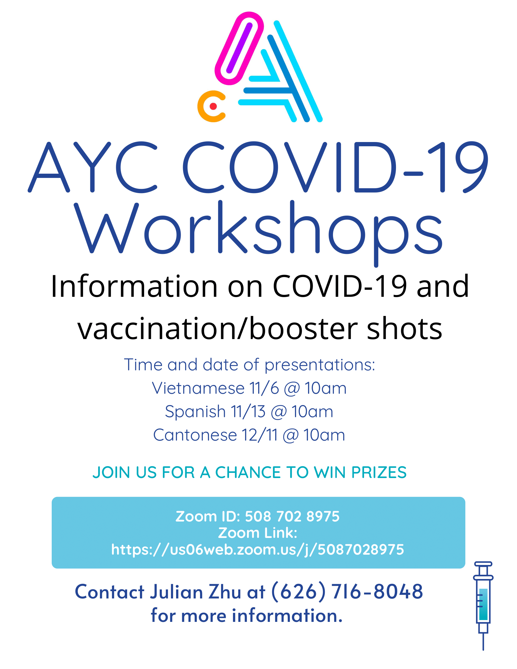 Asian Youth Center is hosting COVID-19 Workshops this Saturday in Cantonese! For Zoom information and time, please see flyers for more details.