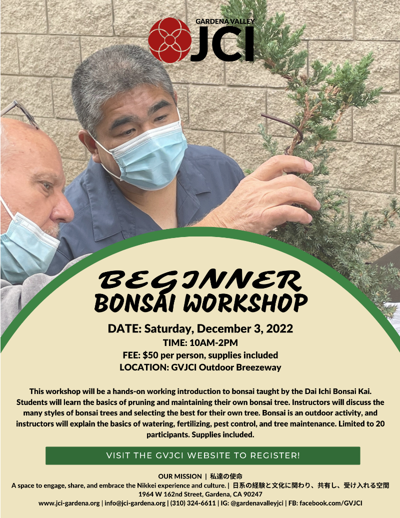This workshop will be a hands-on working introduction to bonsai taught by the Dai Ichi Bonsai Kai. Students will learn the basics of pruning and maintaining their own bonsai tree. Instructors will discuss the many styles of bonsai trees and selecting the best for their own tree. Bonsai is an outdoor activity, and instructors will explain the basics of watering, fertilizing, pest control, and tree maintenance. Limited to 20 participants. Supplies included. $50 fee to participate.