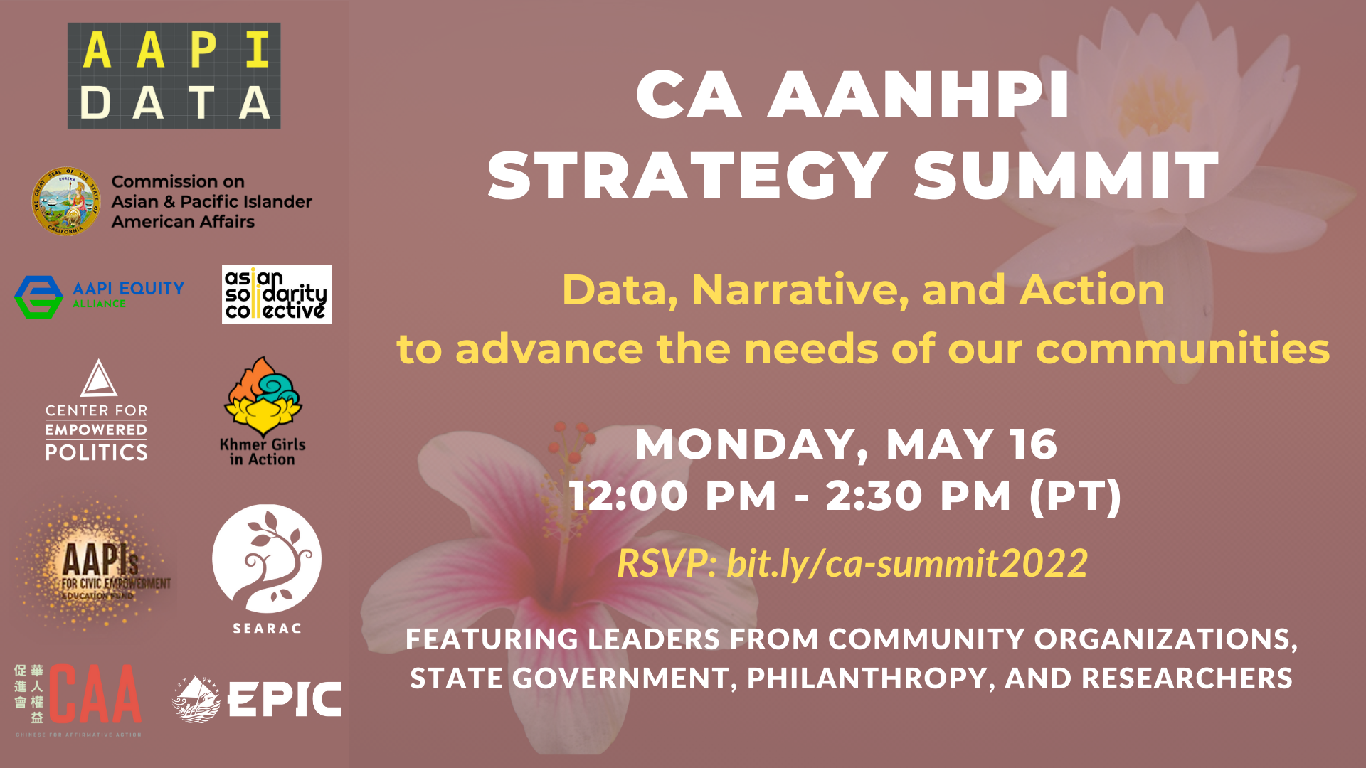 Join AAPI Data and supporters for a virtual CA AANHPI Strategy Summit on May 16, 2022, from 12:00pm - 2:30PM to advance effective policy change in California through data, narrative, and action.