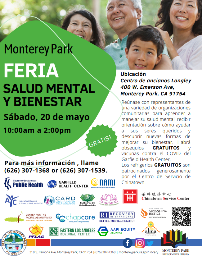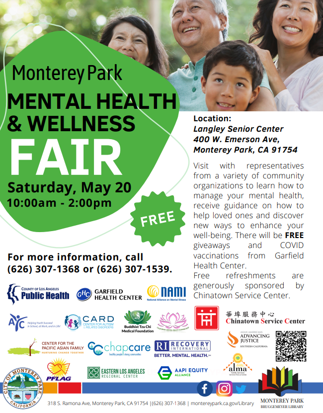 City of Monterey Park’s Mental Health and Wellness Fair being hosted at the Langley Senior Center on Saturday, May 20 from 10am to 2pm by the Monterey Park Bruggemeyer Library, the Recreation and Community Services Department and Chinatown Service Center.