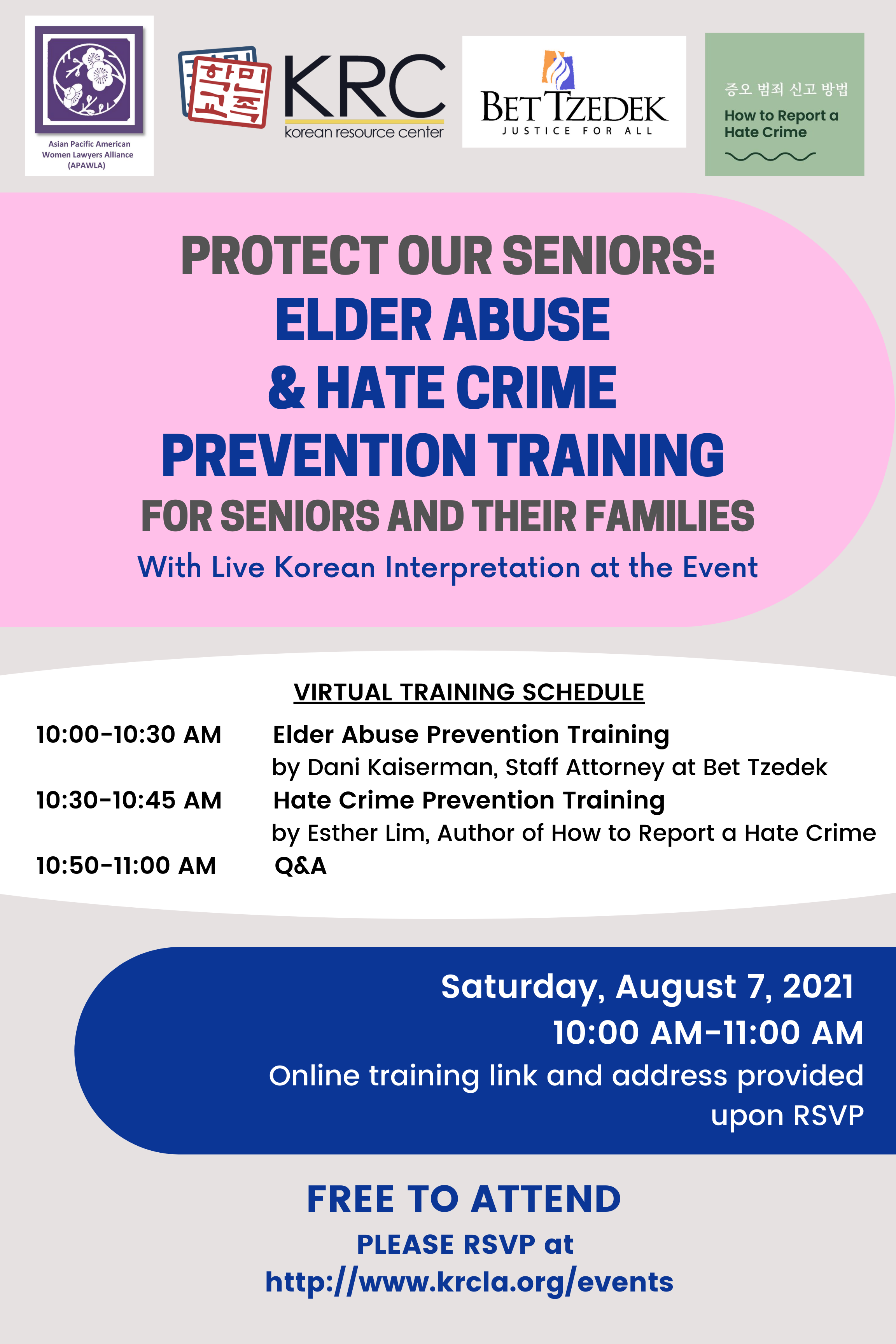 APAWLA, Korean Resource Center (KRC), Bet Tzedek and How to Report a Hate Crime are putting together a hybrid (in-person/virtual) training on Elder Abuse and Hate Crime Prevention training on Saturday, August 7, from 10-11 AM. Please see attached event flyer.