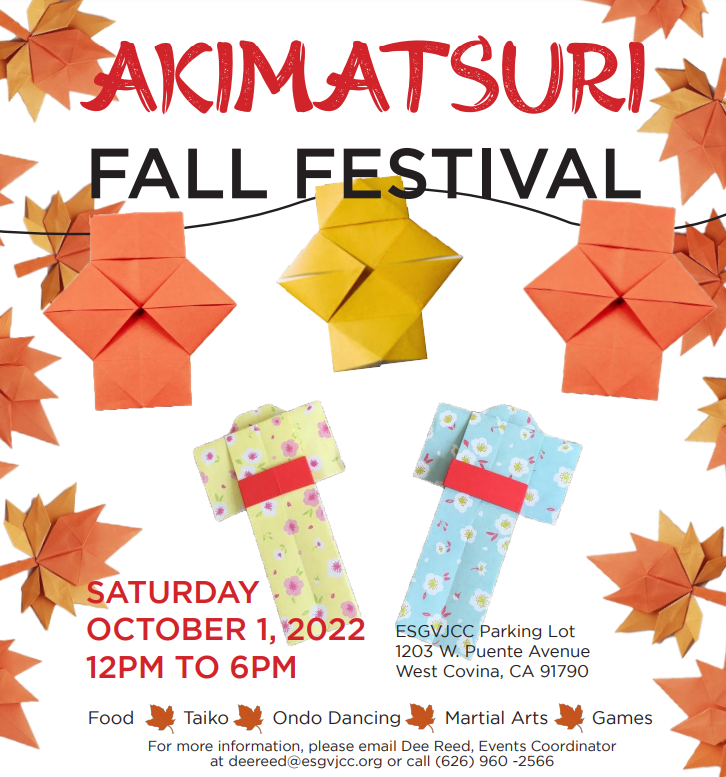 The East San Gabriel Valley Japanese Community Center is proud to present the 2022 Akimatsuri Fall Festival on Saturday, October 1st from 12 pm to 6 pm! This is an in-person event and will be held outdoors in the ESGVJCC parking lot. Join us for cultural demonstrations, performances, games, exhibits, and delicious food! For more information, please email Events Coordinator, Dee Reed at deereed@esgvjcc.org or visit esgvjcc.org!
