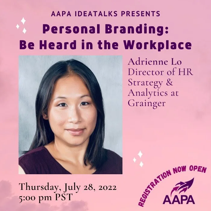 Join us for the next IdeaTalks, Personal Branding: Be Heard in the Workplace with Adrienne Lo! Adrienne is the Director of HR Strategy and Analytics at Grainger, a Chicago-area Fortune 500 company. She frequently speaks to Asian American organizations on how individuals can accelerate their careers.