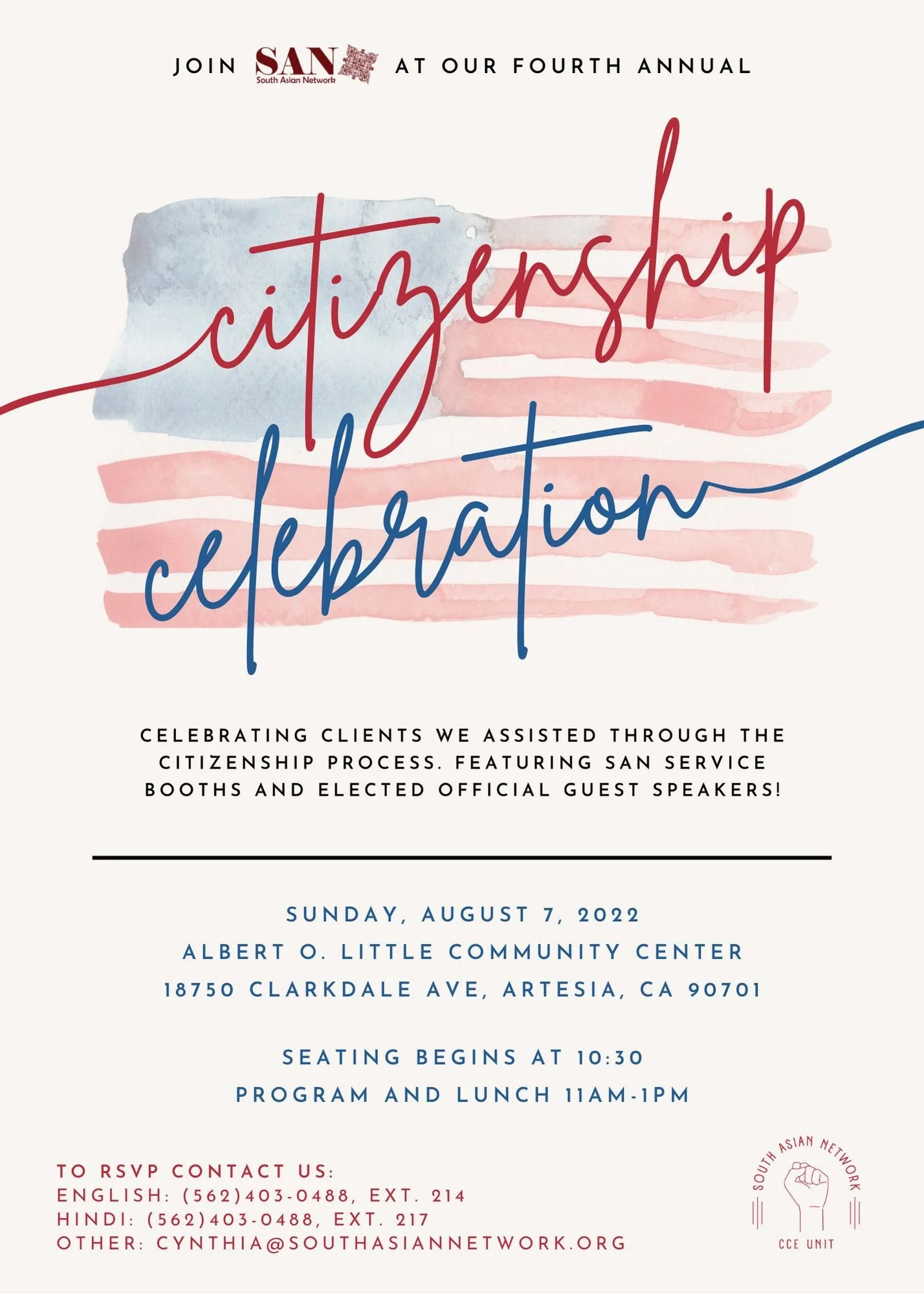 On August 7, 2022, SAN is celebrating the community members we have been able to assist on their journey to U.S. citizenship. For the same, we are delightedly calling out community members and their families to come join us in this celebration. There will be SAN service booths, keynote speakers and lunch!