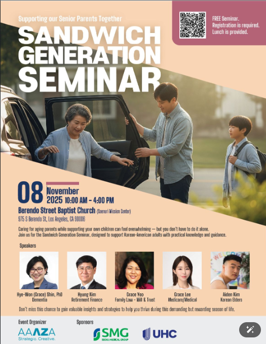Join us for the Sandwich Generation Seminar, designed to support Korean American adults with practical knowledge and guidance.
