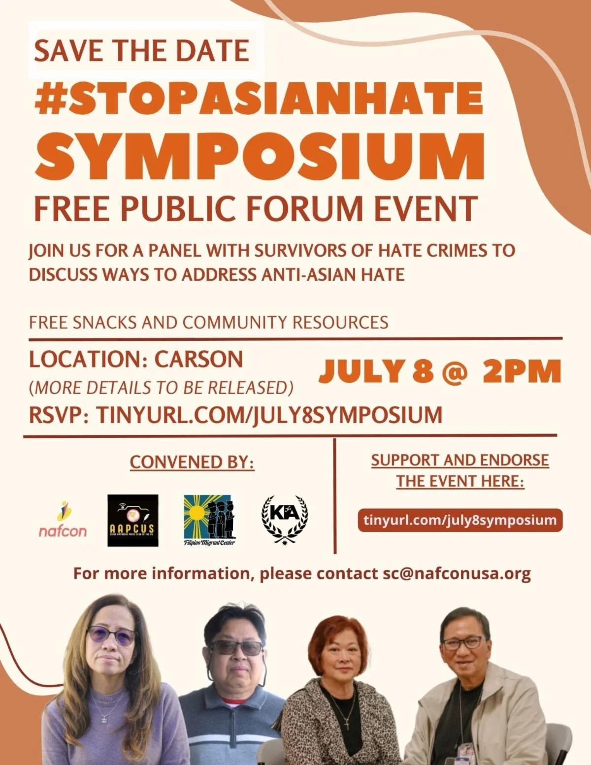 We invite you to join our community partner, the Filipino Migrant Center, for their #StopAsianHate Symposium on July 8, 2023. The event will feature a panel of survivors of hate crimes to discuss ways to address anti-Asian hate impacting our communities. Learn more about the roots of anti-Asian hate and how we can build community power to fight back. The event will be held in-person in Carson. Free resources and snacks will be available. More details to come soon!