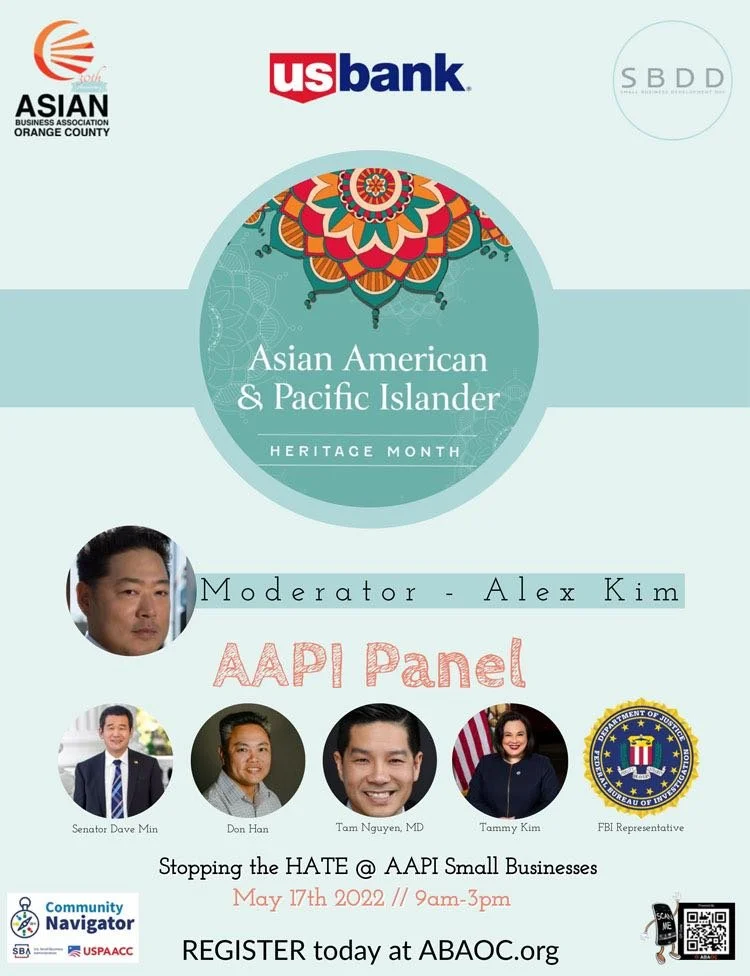 We are extremely excited for our special AAPI Panel: "Stopping the Hate @ AAPI Small Business" that will be presented at this year's ABAOC Small Business Development Day on May 17, 2022 from 9am-3pm at the Delta Hotel by Marriott Anaheim. There will be a panelist representative from nearly every level of government sharing key information and insights into this very important issue in our community.