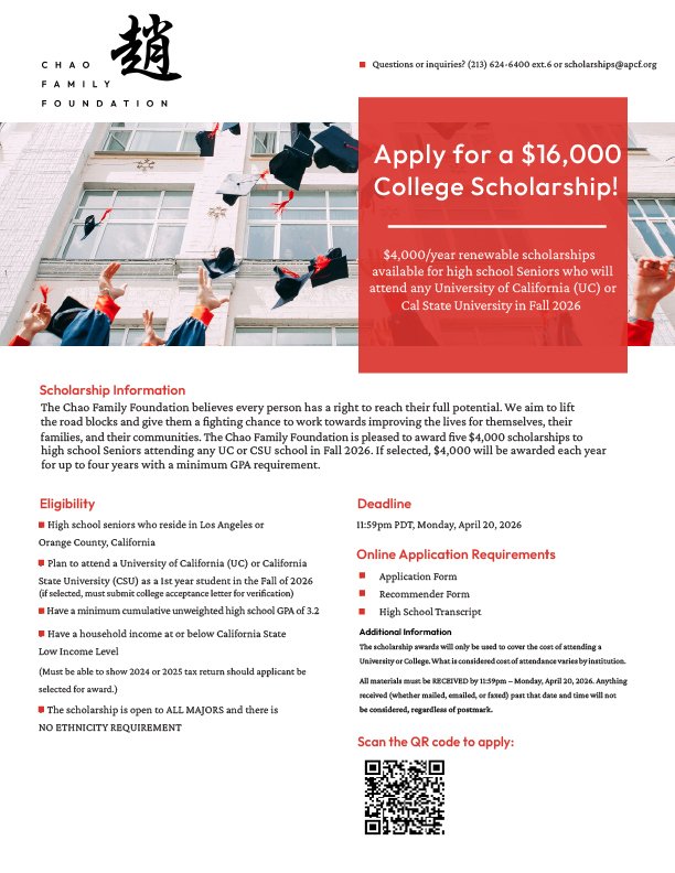 Contact by phone: (213) 624-6400 ext. 6 or by email: scholarships@apcf.org.