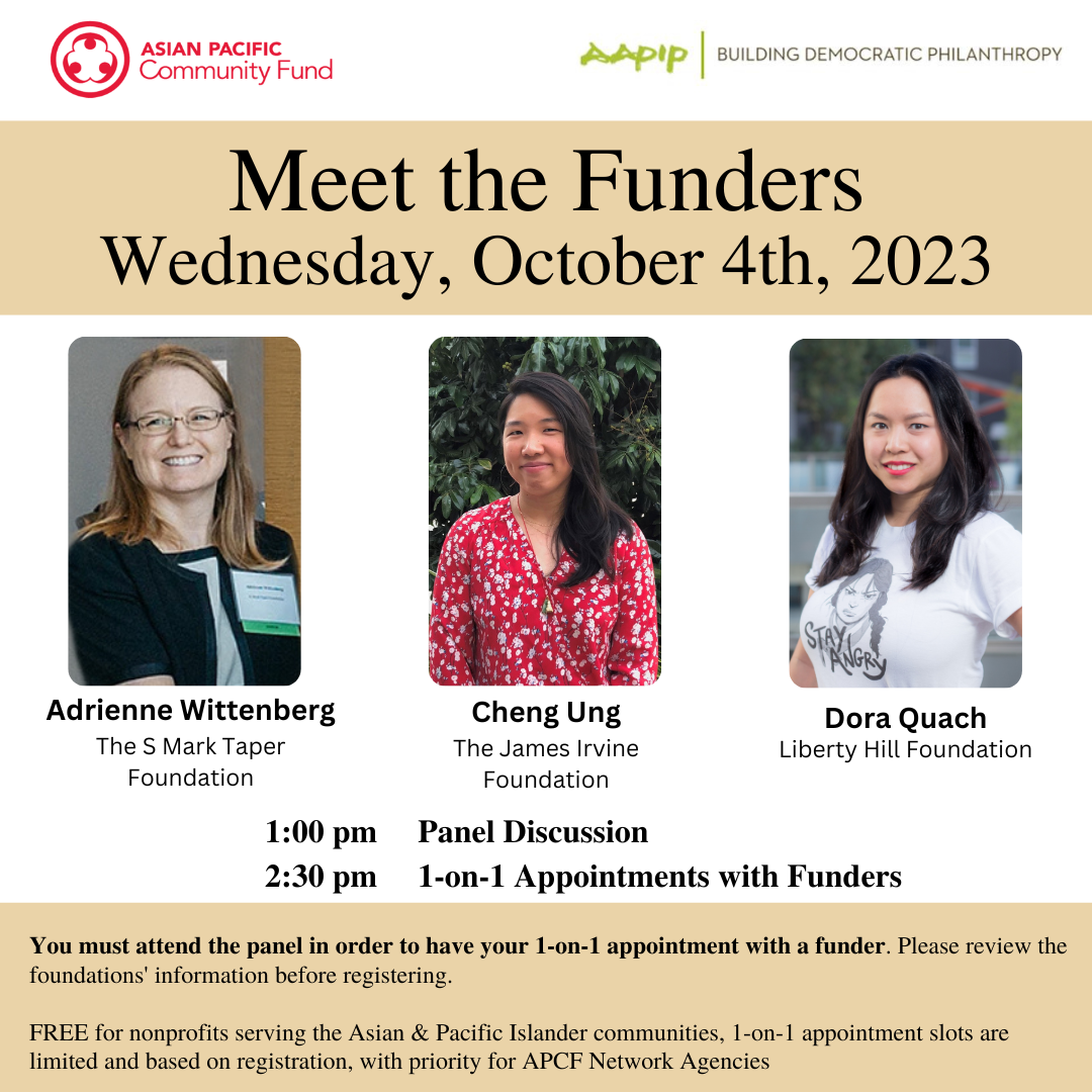 Thank you for registering to APCF’s Meet the Funders event on Wednesday, October 4th at 1:00pm.